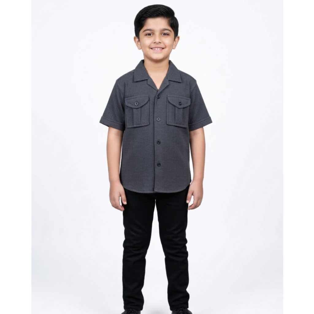 Upgrade your child’s smart-casual wardrobe with this sophisticated charcoal grey short-sleeve shirt. Expertly crafted from high-quality Dobby Cotton, this shirt features a fine geometric textured weave that provides a premium tactile feel while ensuring maximum breathability for all-day comfort.
