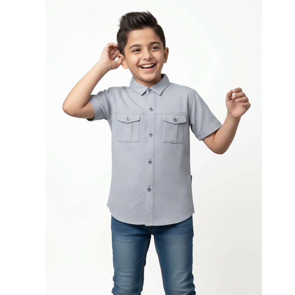 Add a touch of rugged elegance to his wardrobe with this Sky Grey Dobby Cotton shirt. The fabric features a fine-grained, woven texture that is both breathable and durable, perfect for active days. Following a utility-inspired design, it includes dual chest flap pockets and a structured fit. The soft grey tone makes it incredibly versatile, while the premium textured finish ensures he stays comfortable and stylish from morning to evening.