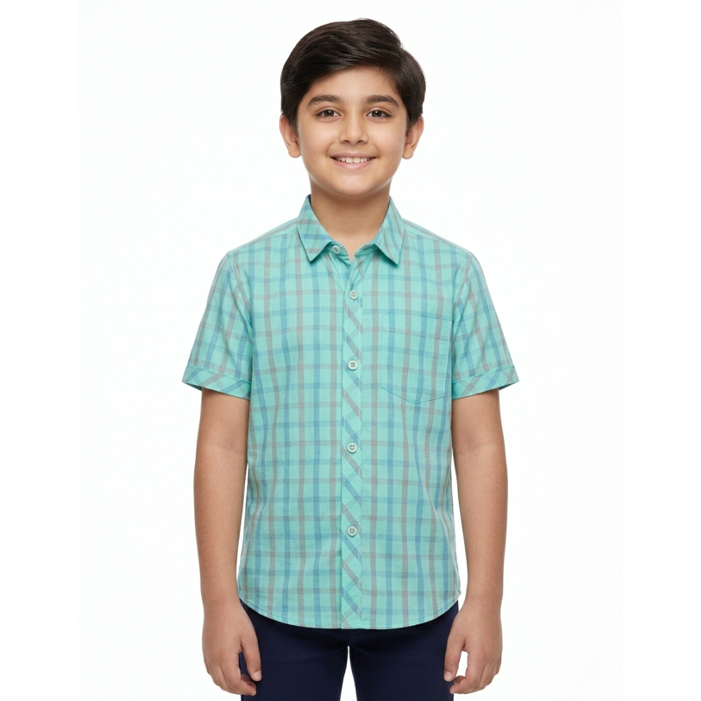 Brighten up your young one’s wardrobe with this fresh and vibrant short-sleeve button-down shirt. Featuring a crisp aqua mint base with a subtle windowpane check pattern in soft grey and white, this shirt offers a clean, airy aesthetic perfect for warm-weather outings and daytime events.