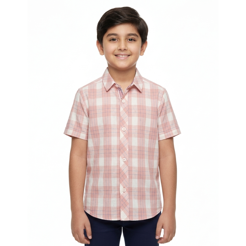 Brighten up your young one’s wardrobe with this fresh and charming peach and cream plaid shirt. This piece features a refined heritage check pattern in a soft peach blossom palette, offering a light and sophisticated look for any warm-weather occasion.