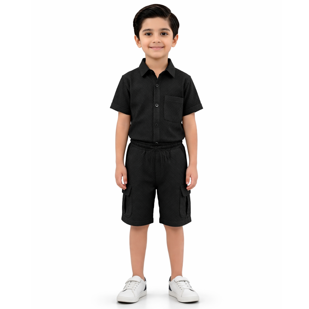 Give your young explorer a sharp, coordinated look with this two-piece cargo shirt and shorts set. Designed for both style and play, this monochromatic ensemble features a textured short-sleeve button-down shirt paired with matching utility-style shorts.