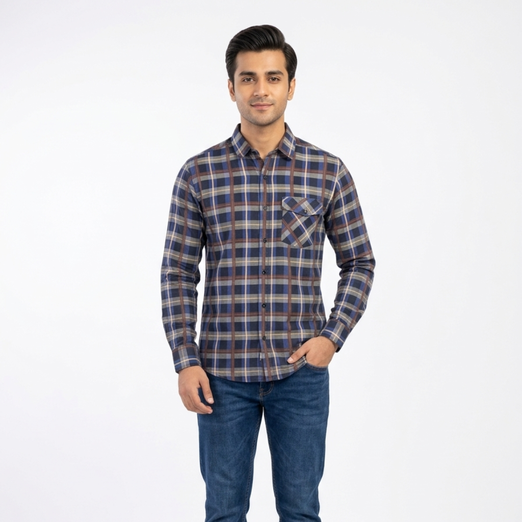 Add a touch of sophisticated warmth to your wardrobe with this multi-tonal grid check shirt. The design features a deep indigo base overlaid with a structured grid of rust-orange and sand-colored checks, creating a rich, earthy palette that is both modern and versatile.