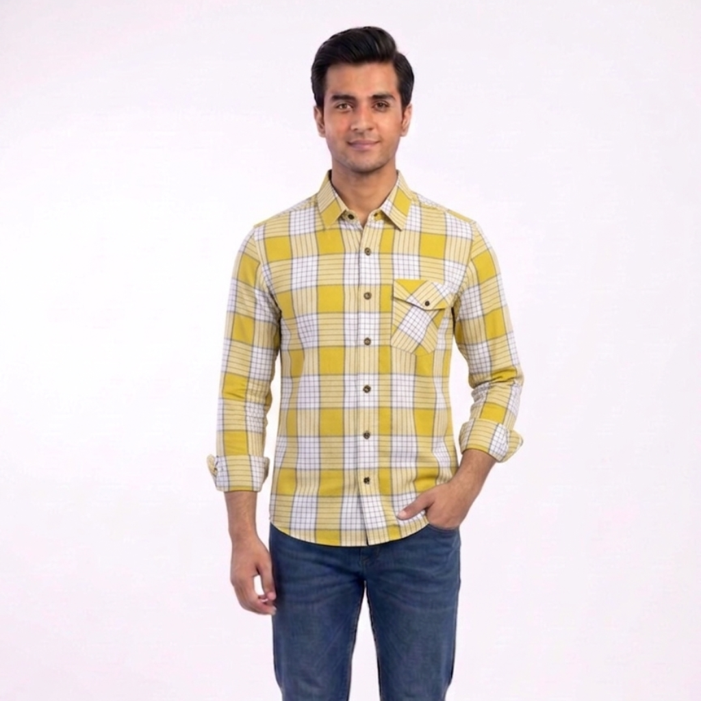 Brighten up your wardrobe with this vibrant mustard yellow and white checkered shirt. Featuring a bold, oversized plaid pattern with subtle horizontal line detailing, this shirt is designed for those who want to stand out.